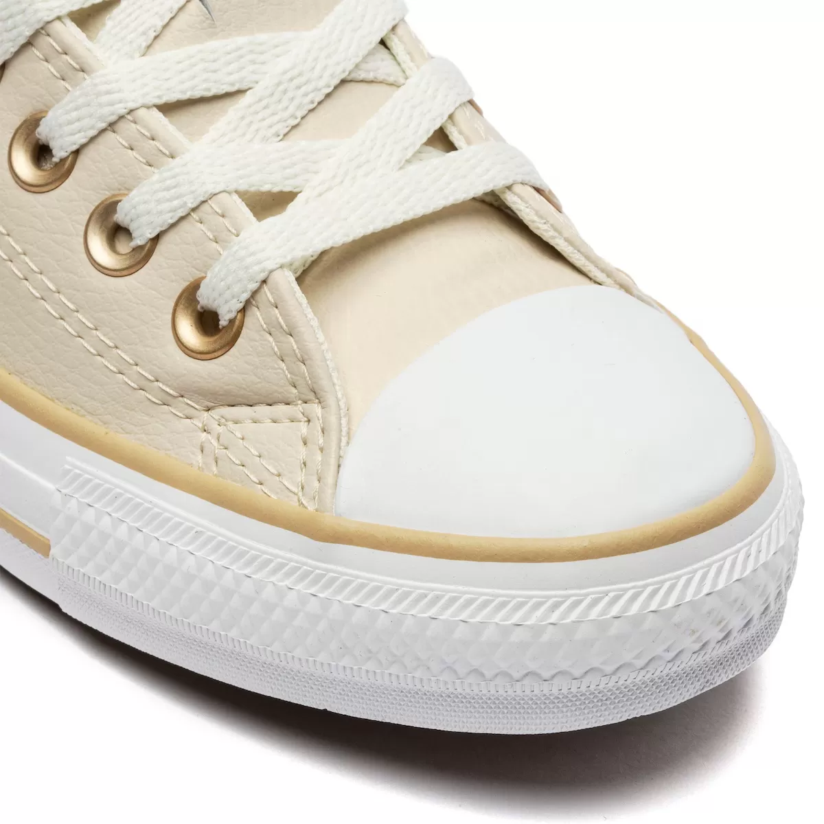 Detalhes icônicos: biqueira de borracha, ilhoses metálicos e patch lateral Converse.